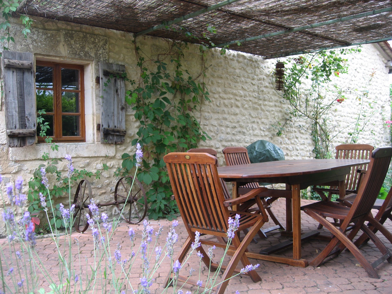 A sloping lawn with a quiet terrace on the east side which is designed for summer breakfasts and shady siestas. The kitchen door opens out to the main terrace on the west side where lunch and evening meals can be enjoyed in the shade of the laurel hedge and bamboo canopy. Both terraces are furnished with hard wood tables and chairs.