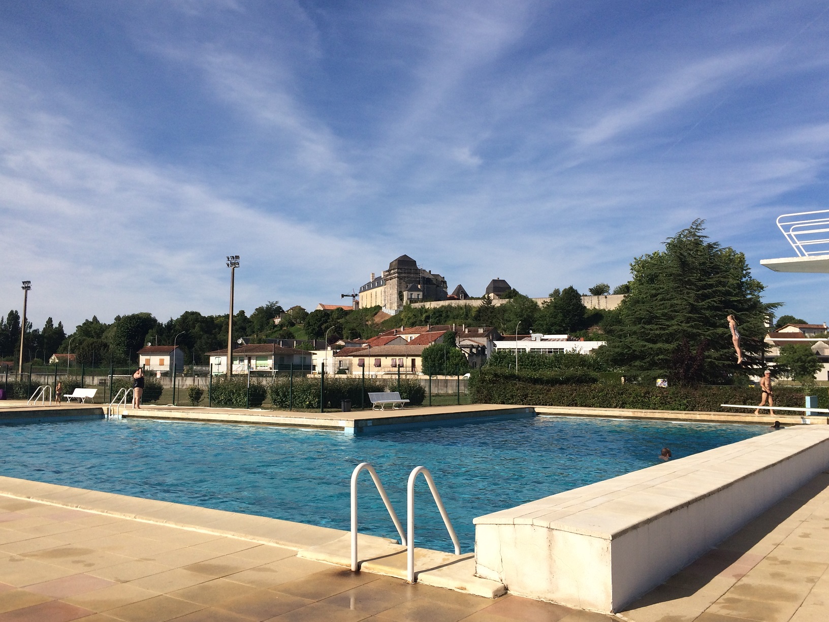 There is an excellent communal outdoor pool in Chalais next to the football pitch and tennis club. It has a 25 metre pool, a diving area with 3 high boards and a separate childrens’ paddling pool. It is open during the summer months only usually between 10.30am – 1:00pm, and 3:00pm – 7:00pm but check their website. You need to bring your own towels and men/boys must wear swimming trunks/Speedos not boardshorts.